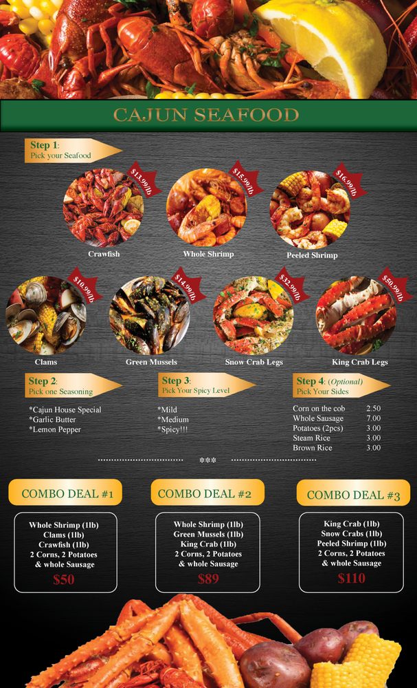 1 lb. shrimp, 1 lb. green mussels, 1 lb. king crab, 2 pieces corns, 2 pieces potatoes and whole sausage.